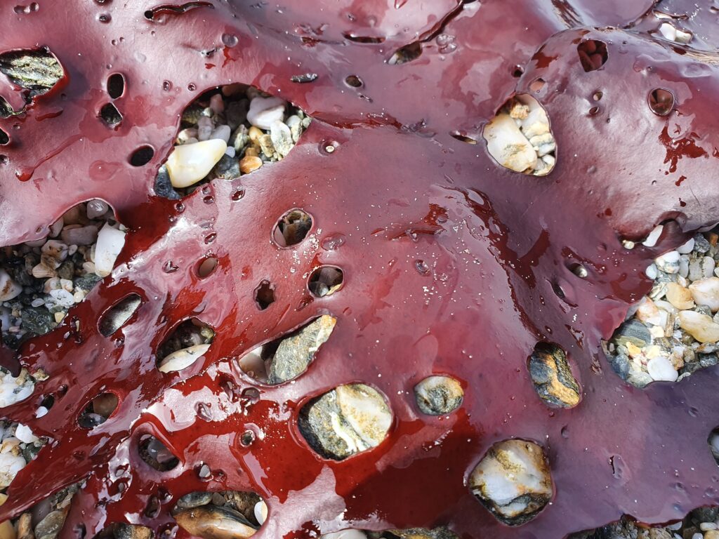 It was one of these samples that I found that lead me on a long but for me fascinating process of discovery. While I was on Belle-île in Brittany I found a deep red algae that fascinated me. It was covered with a rash of holes. I needed to give this a name. I learnt so much in the process. Algae is not easy to catalogue. I began an adventure to discover something so apparently simple. My many thanks to Carolyn Ricci & Bob Balcock, Honorary Associate of the State Herbarium of South Australia; Dr Amanda Savoie, Research Scientist and Director the Centre of Arctic Knowledge and Exploration, Ottawa; Prof. Eric Thiébaut of the Sorbonne Université & director of the UAR2017 OSU STAMAR Station biolgique de Roscoff and his colleagues who were all very helpful, a particular thanks to Dr. Sandrine Derrien-Courtel at the Station Marine de Concarneau and finally Pr Dr Line Le Gall, Department of Origins and evolution, Muséum National d’Histoire Naturelle, Paris, France, who tested a sample for me and confirmed that it was an example of Dilsea carnosa. The holes had developed to protect the seaweed from the extreme currents. This was really three exciting months, I had never expected to learn so much from one humble and beautiful piece of algae found on the beach.