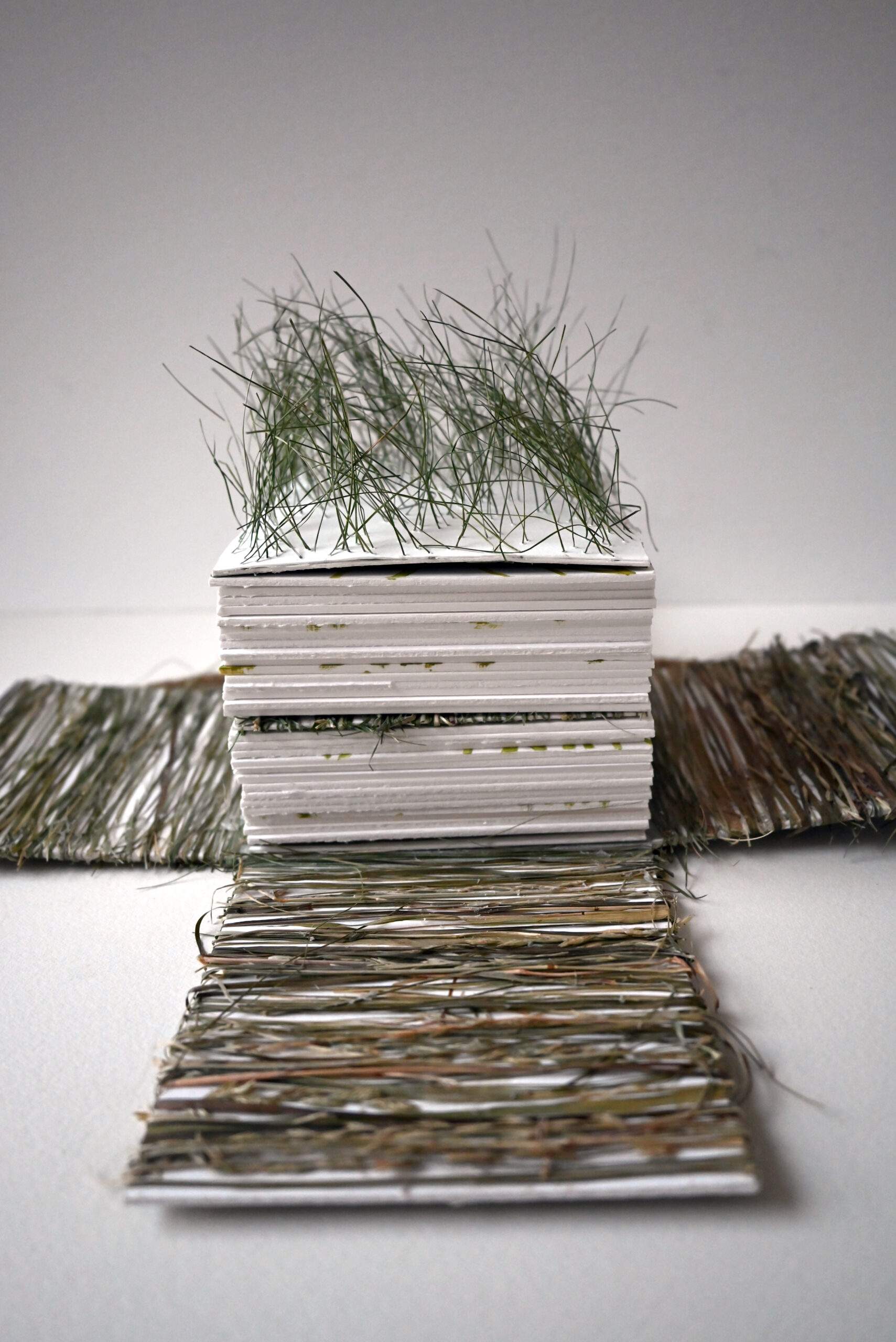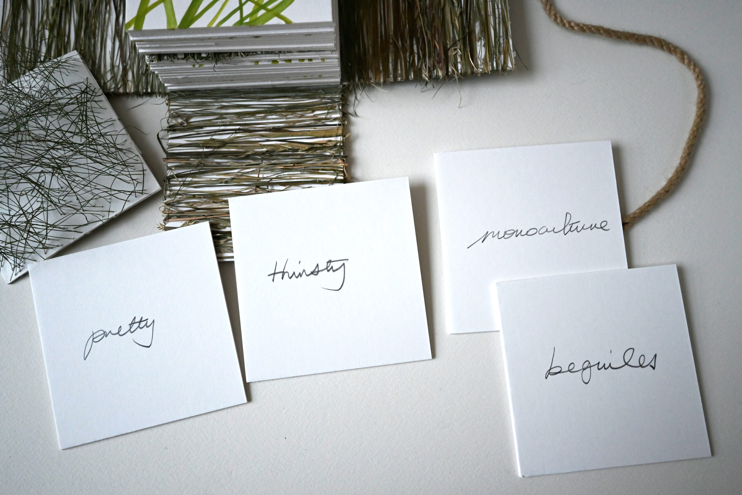 Many of the works include text as well as drawings. For example the Love Letter to my Grass contains the following:Pretty, thirsty, mono-culture beguiles/Care, love. optimistic equilibrium/Alive, still patchy, unbalanced rye/Questioning, uneasy green/Rebellious tufts, copious variety, baldness, bare/Happy verdant lawn.