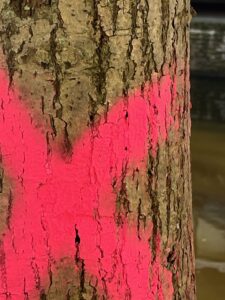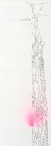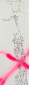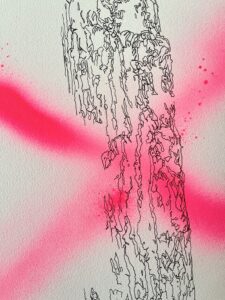 One day a man stepped out of his car, applied a cross in pink neon spray paint and several months later it was destroyed. The incredible pinkness of the spray paint made this tree stand out. Within my drawings I wanted to keep that strength and somewhat aggressive nature in such a seemingly gentle colour. This is a statement about vanishing trees and their neglected or overlooked role in our urban ecosystems. It is a plea to look up, to embrace their value and it is a hymn to a disappearing feature. It is also a tree that inspired neighbourliness-I planted a garden for insects at its base. I have named this series for my neighbour.